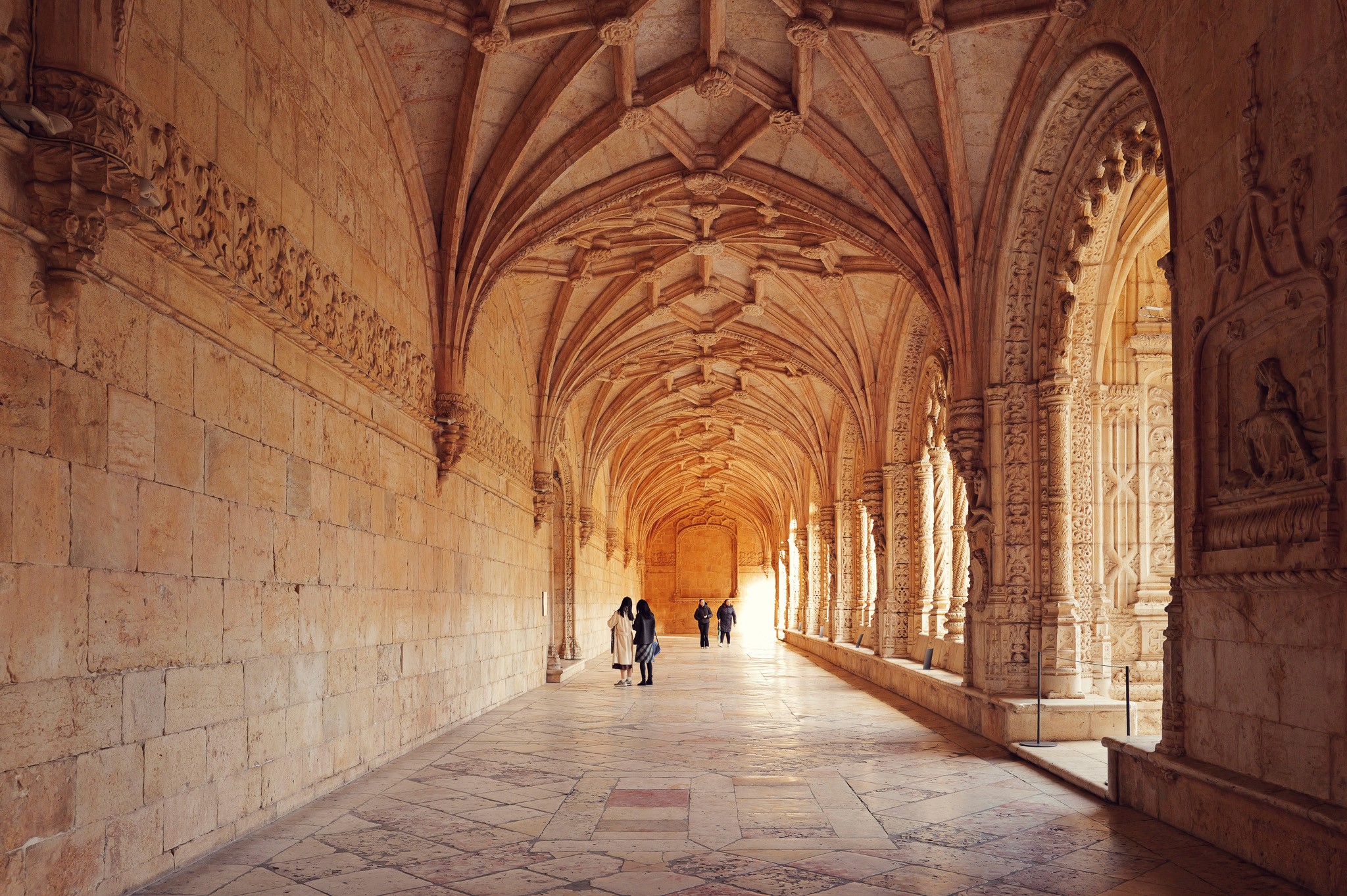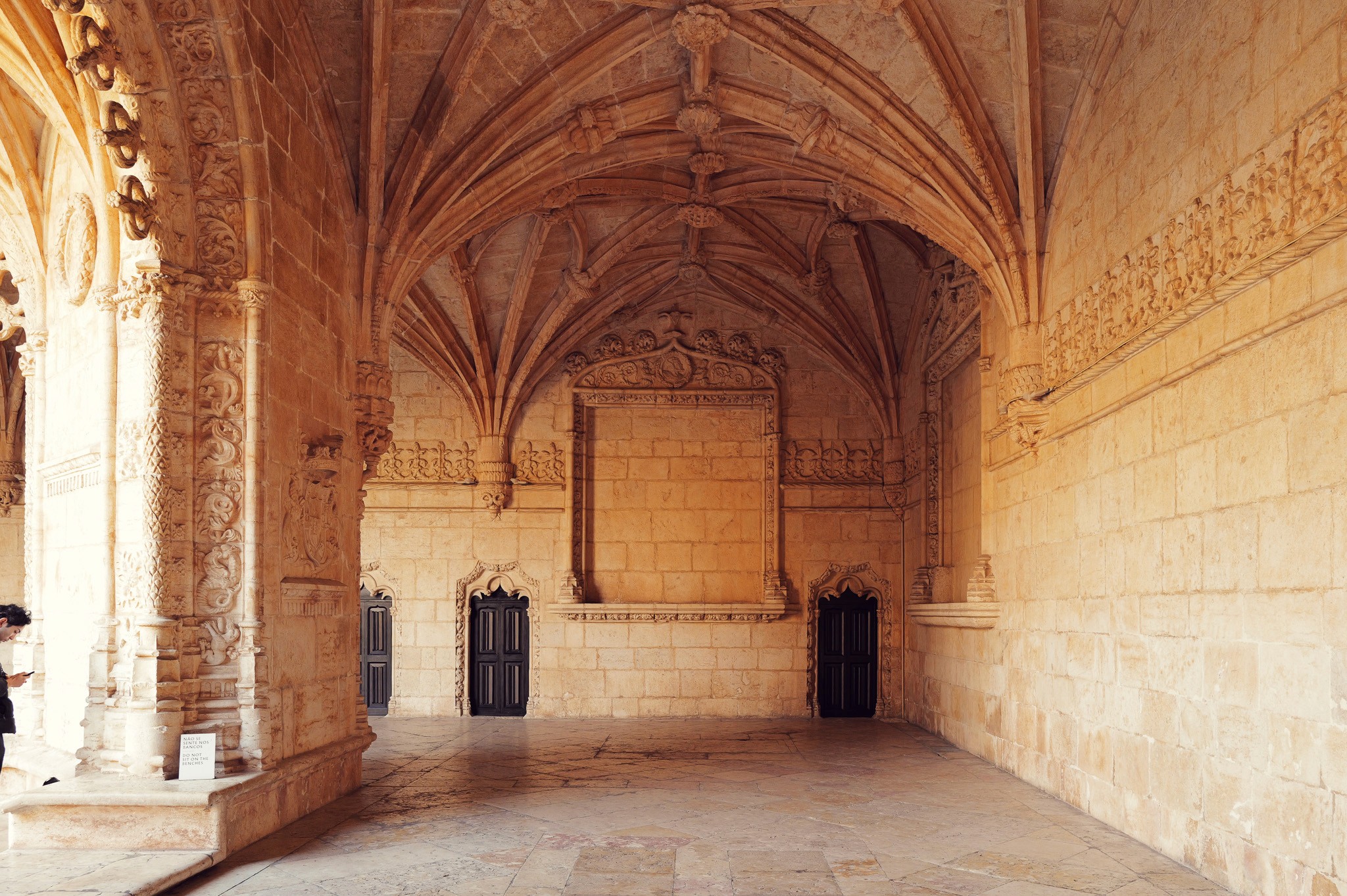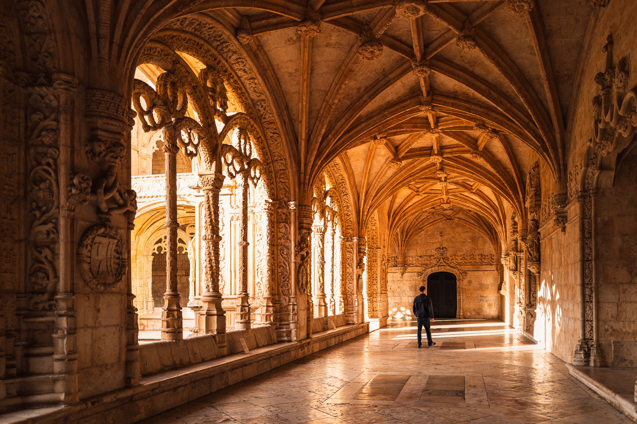 The nave of the church is the first thing that stops you. It doesn't announce itself — you walk through a low passage and then suddenly the ceiling is impossibly far above, fan vaulting spreading outward from clusters of octagonal columns the way frost spreads across a window. Manuel I ordered this built in 1501 to commemorate Vasco da Gama's return from India. The wealth of the spice trade paid for every carved rope, every stone armillary sphere.