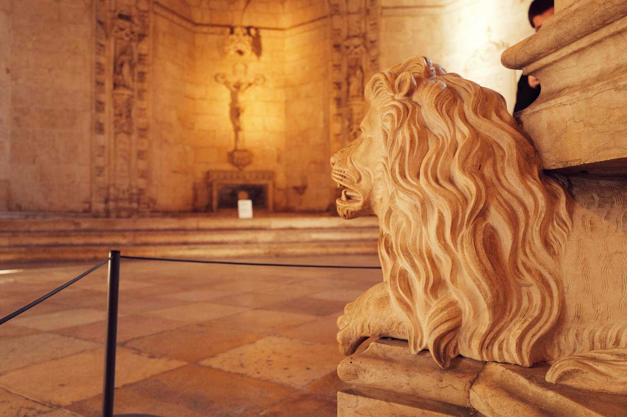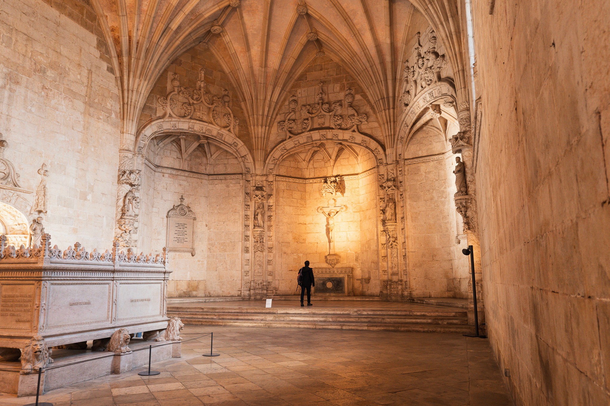 The tomb room held one figure in silhouette when I passed through — a person with a backpack, standing at the far end, facing the crucifix above the altar. The room was otherwise empty. The light behind the altar came from somewhere I couldn't see, warm and amber, catching the carved stone niches and throwing deep shadow behind the statues.