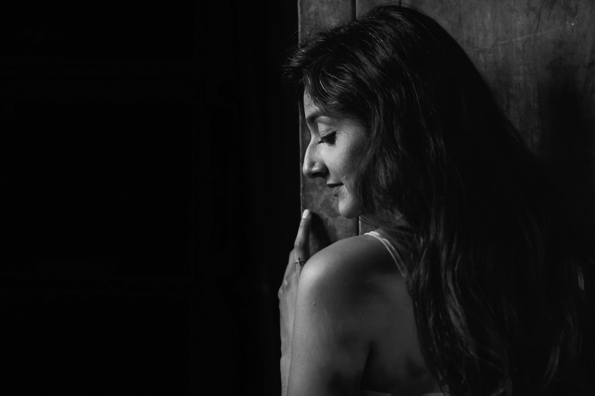 The wooden doorframe gives this image its specificity. The grain of the wood reads as vertical texture behind the smooth curve of her profile, creating a material dialogue between organic surfaces: skin and timber, both warm, both bearing the evidence of time.