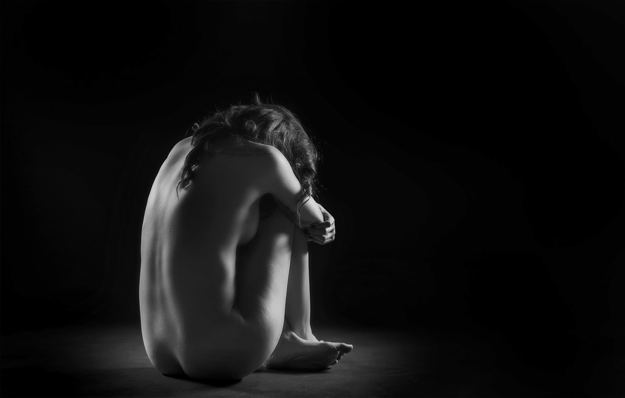 I asked her to make herself as small as she could. Head down, knees in, arms wrapped. She folded herself into this shape in less than a second, and the result was a form so complete and self-contained that it read as both vulnerable and impregnable at the same time.