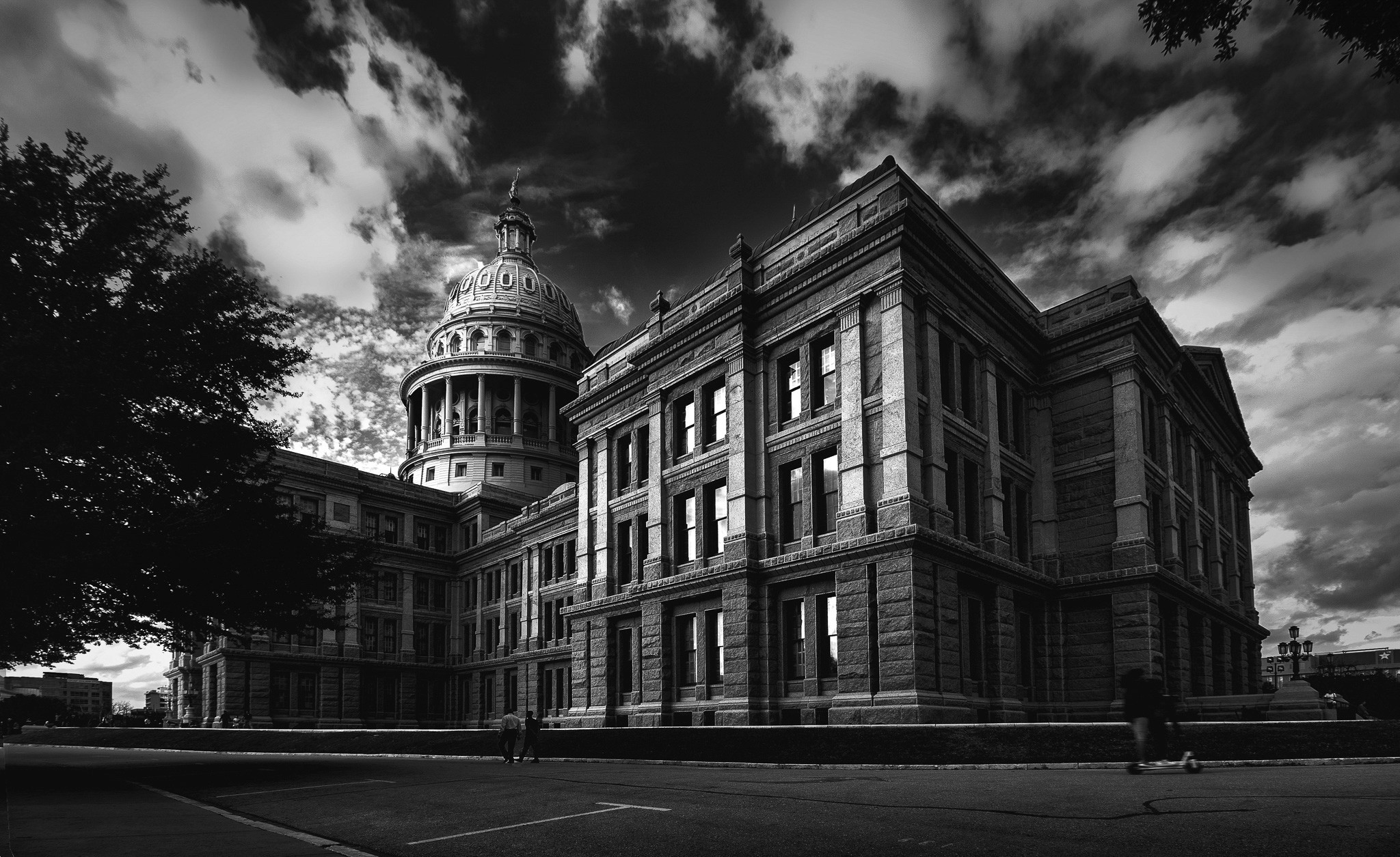 I photographed the Texas Capitol from the southeast corner in the late afternoon, when the sun had dropped low enough to throw the facade into three-quarter light and the clouds had organized themselves into something worth including. The ultra-wide angle from a low tripod position exaggerates the vertical mass of the building, which is the point. This is architecture designed to communicate authority, and the photograph should honour that intention rather than neutralize it.